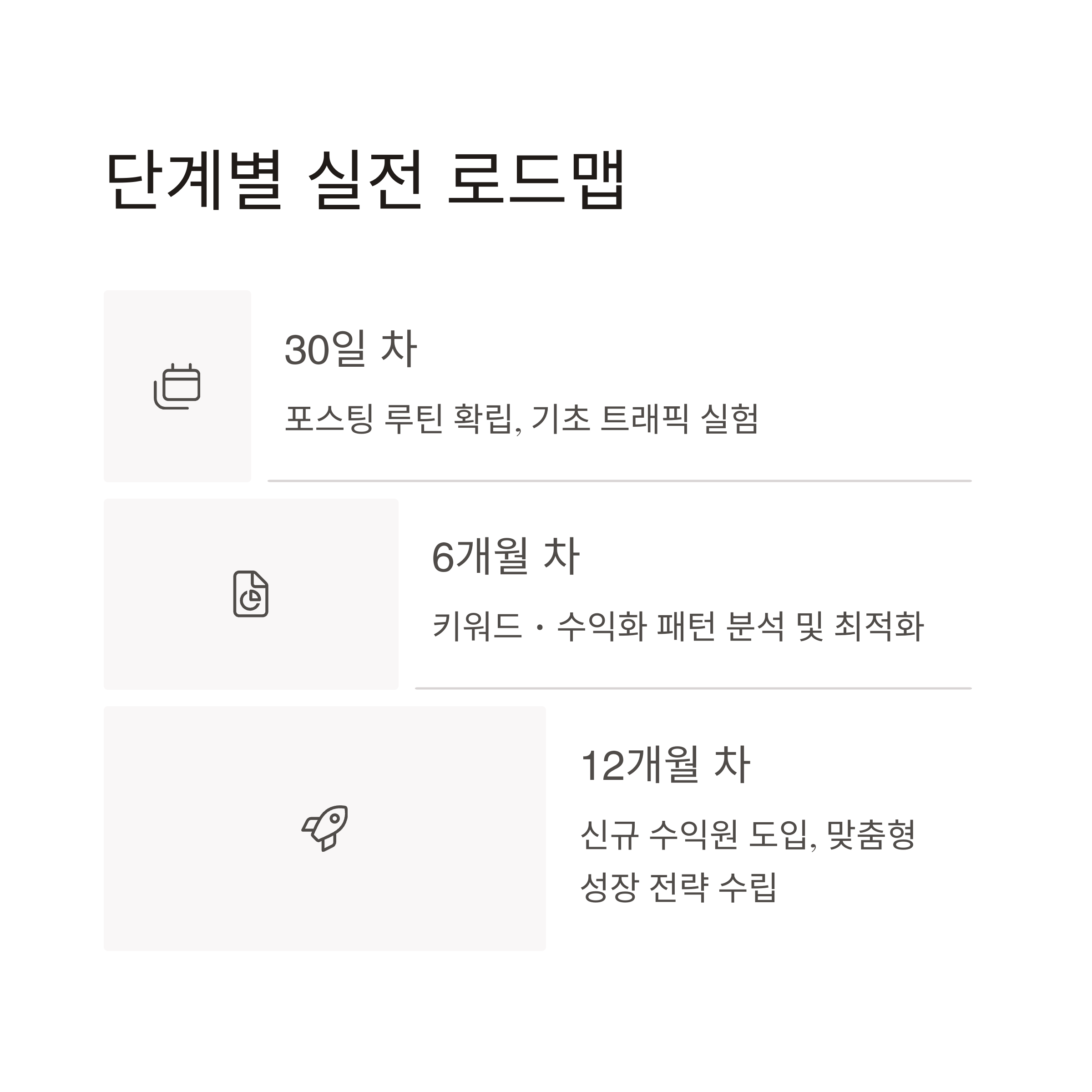 - 수익 강화 (13~18개월) : 고수익 키워드 집중, 디지털 상품 기획