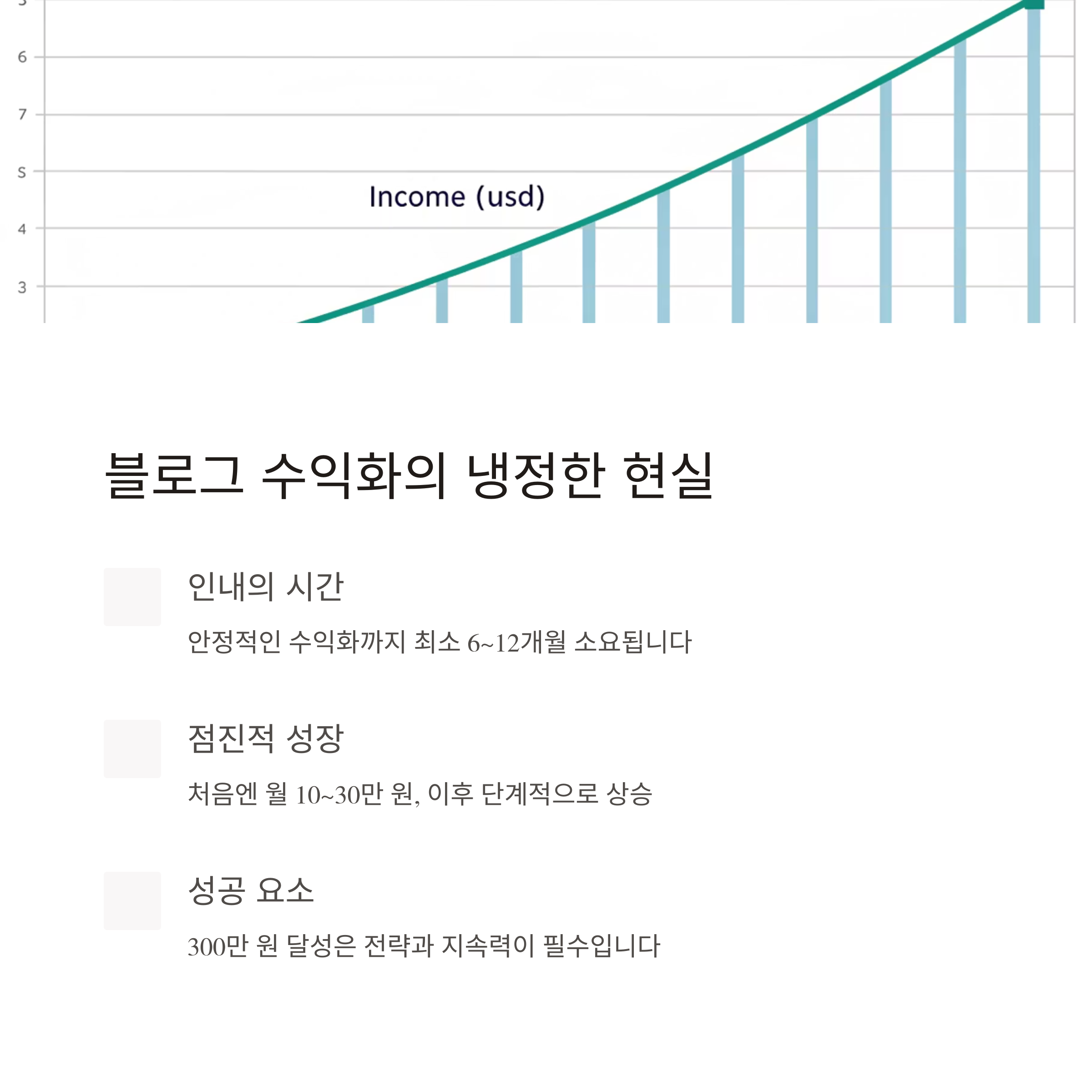 - 6개월: 100개 이상 글 발행 + 월 수익 30~50만원 도달