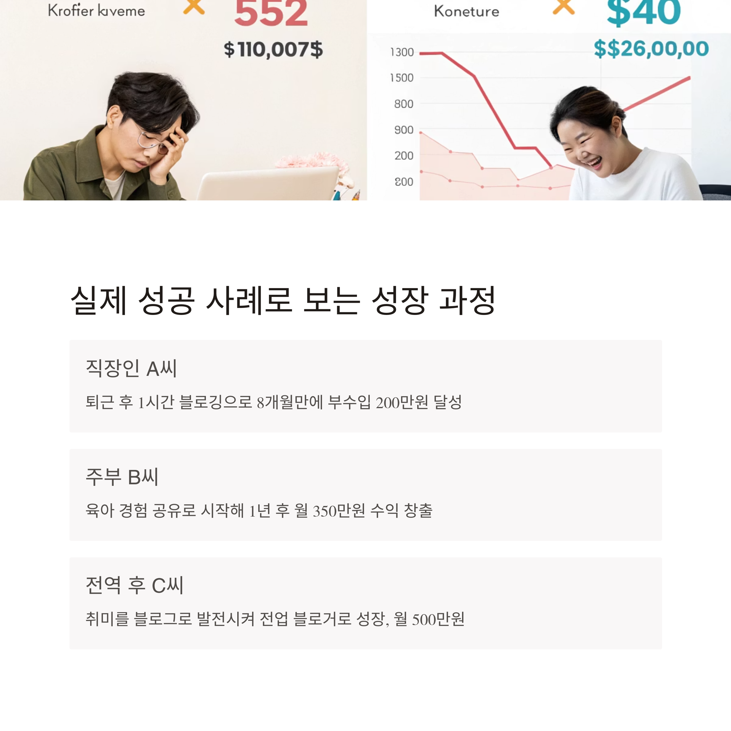 - 여행 블로거 C씨: 24개월 만에 블로그 부업→전업 전환