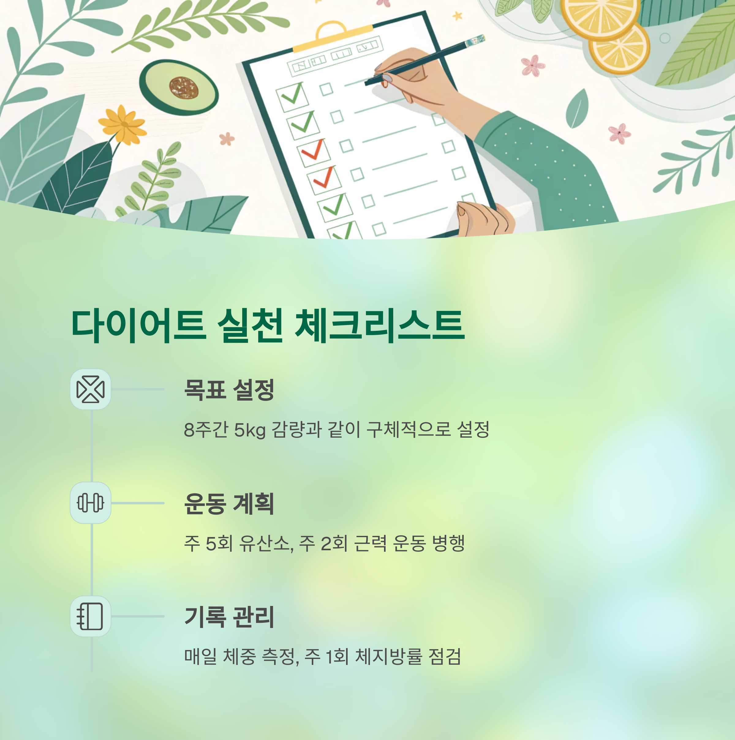 다이어트를 위한 구체적 실천 단계와 체크리스트는 다음과 같습니다.