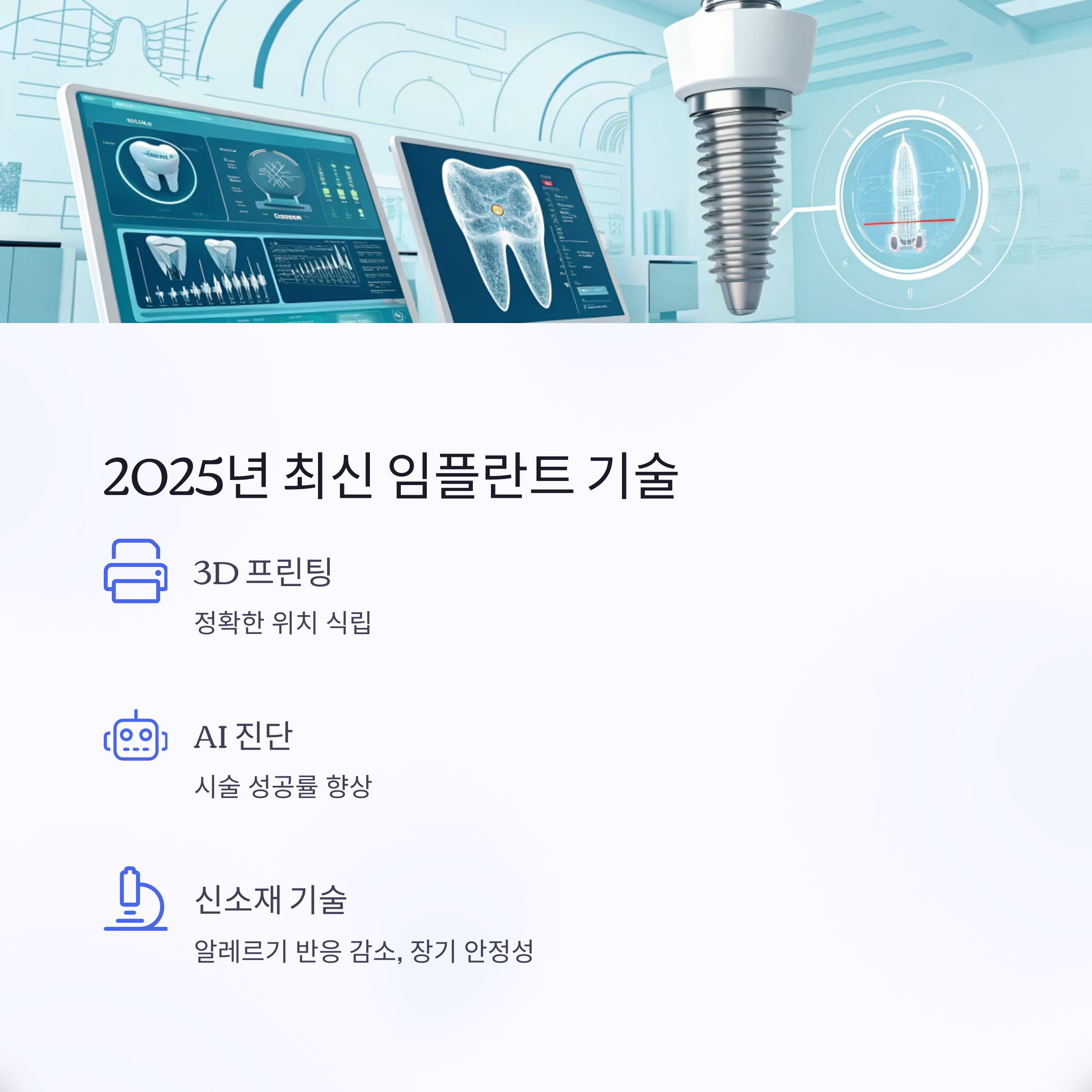 2025년에는 3D 프린팅, AI 진단, 디지털 가이드 등이 임플란트 시술의 핵심 기술로 자리 잡고 있습니다.