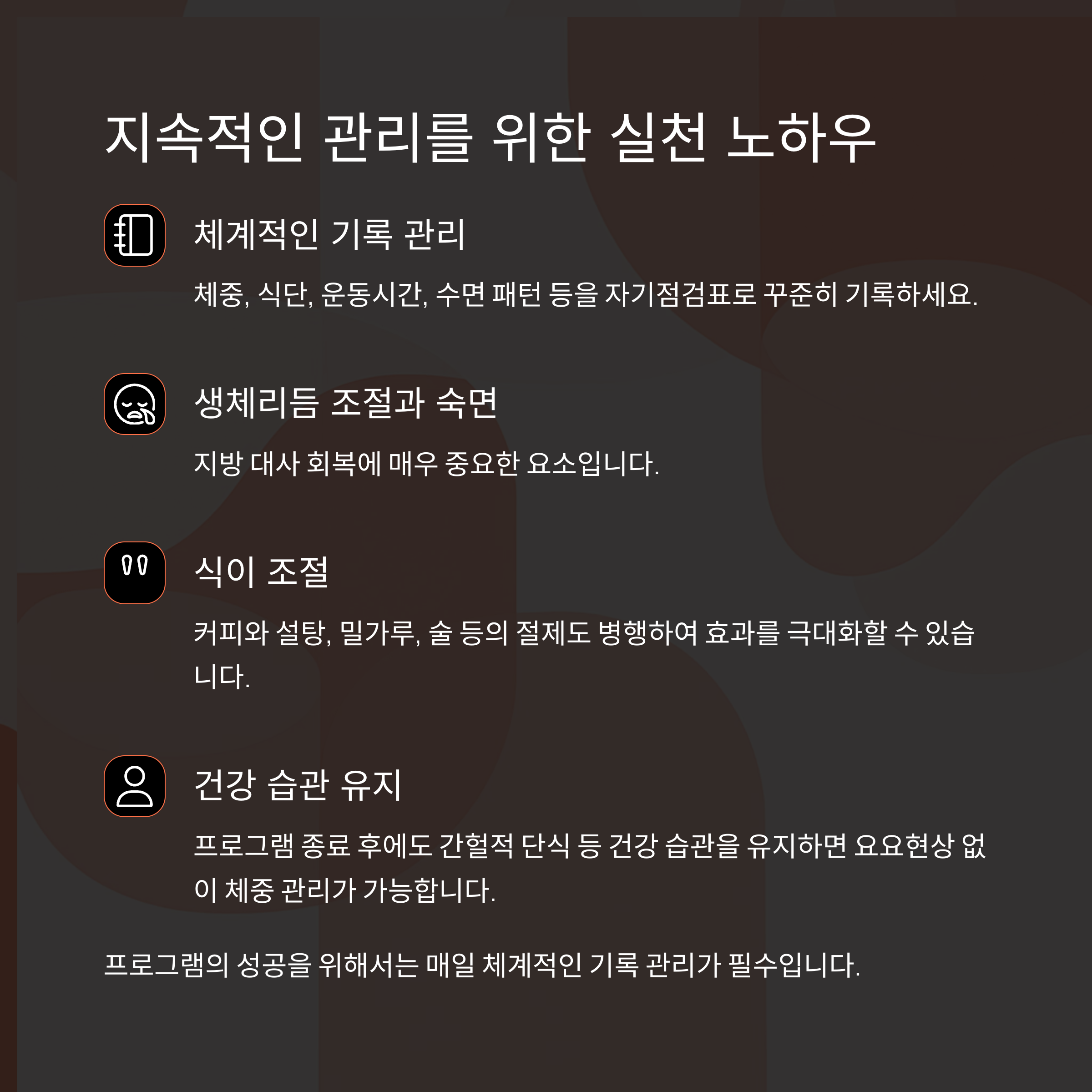 프로그램의 성공을 위해서는 매일 체계적인 기록 관리가 필수입니다.