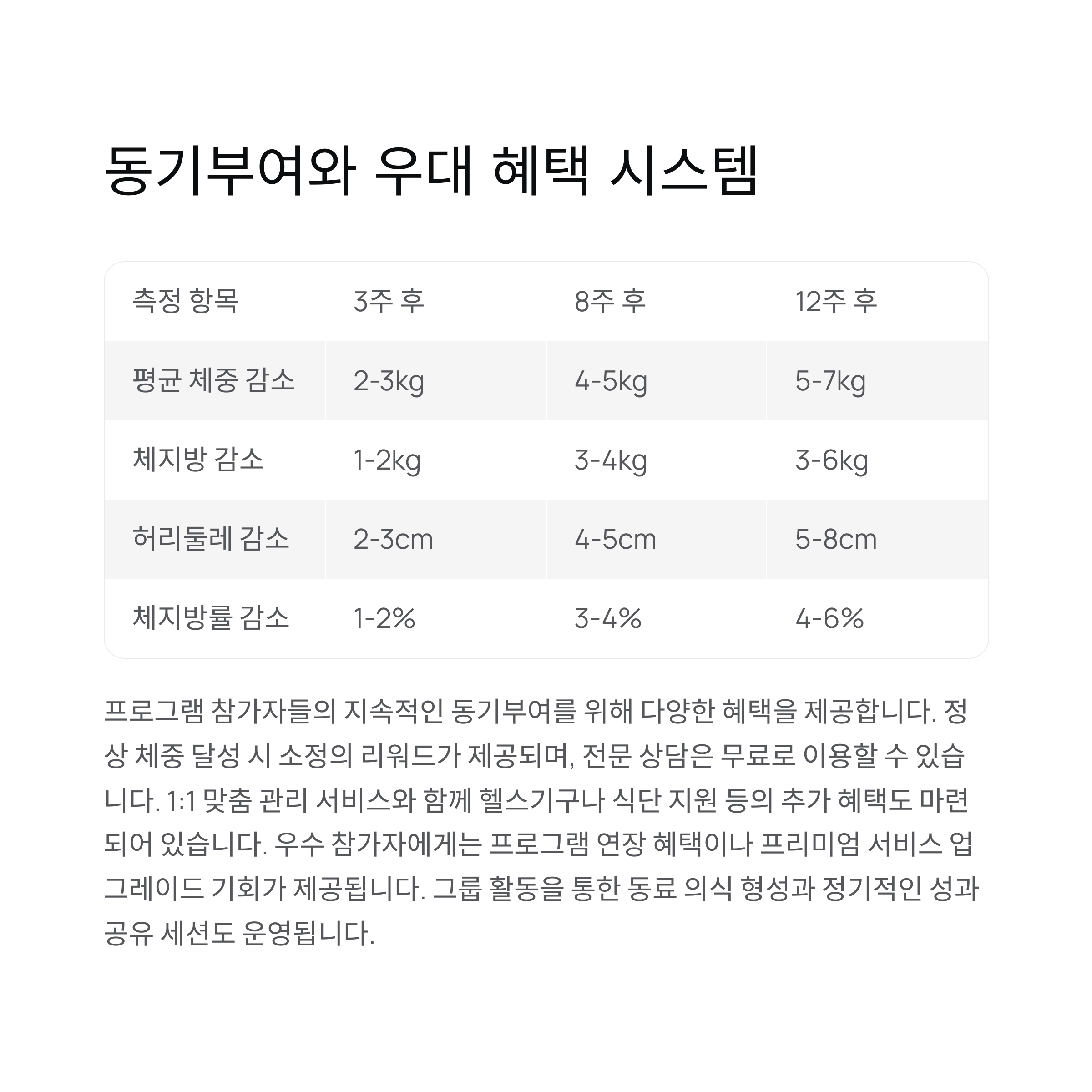 | 체지방률 감소 | 1-2% | 3-4% | 4-6% |