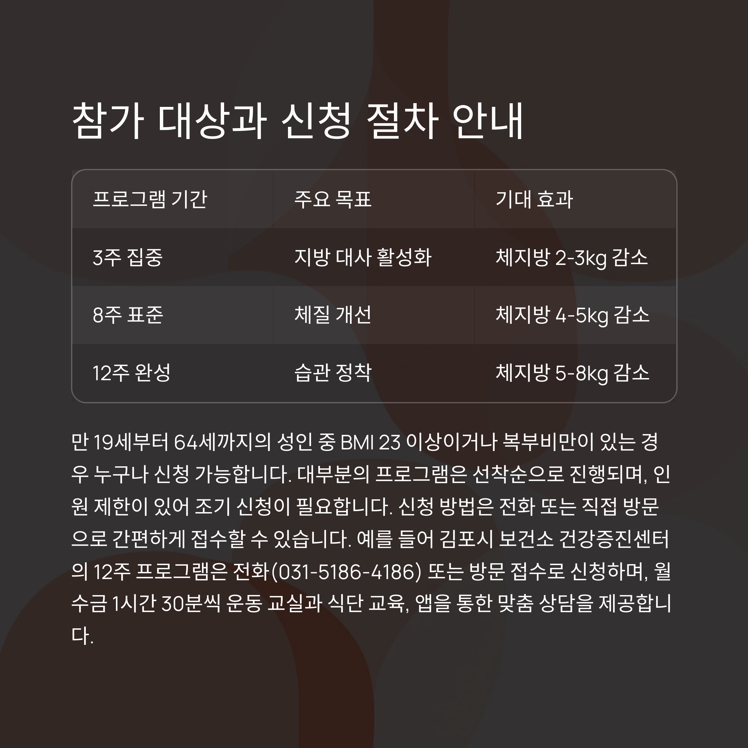 예를 들어 김포시 보건소 건강증진센터의 12주 프로그램은 전화(031-5186-4186) 또는 방문 접수로 신청하며,