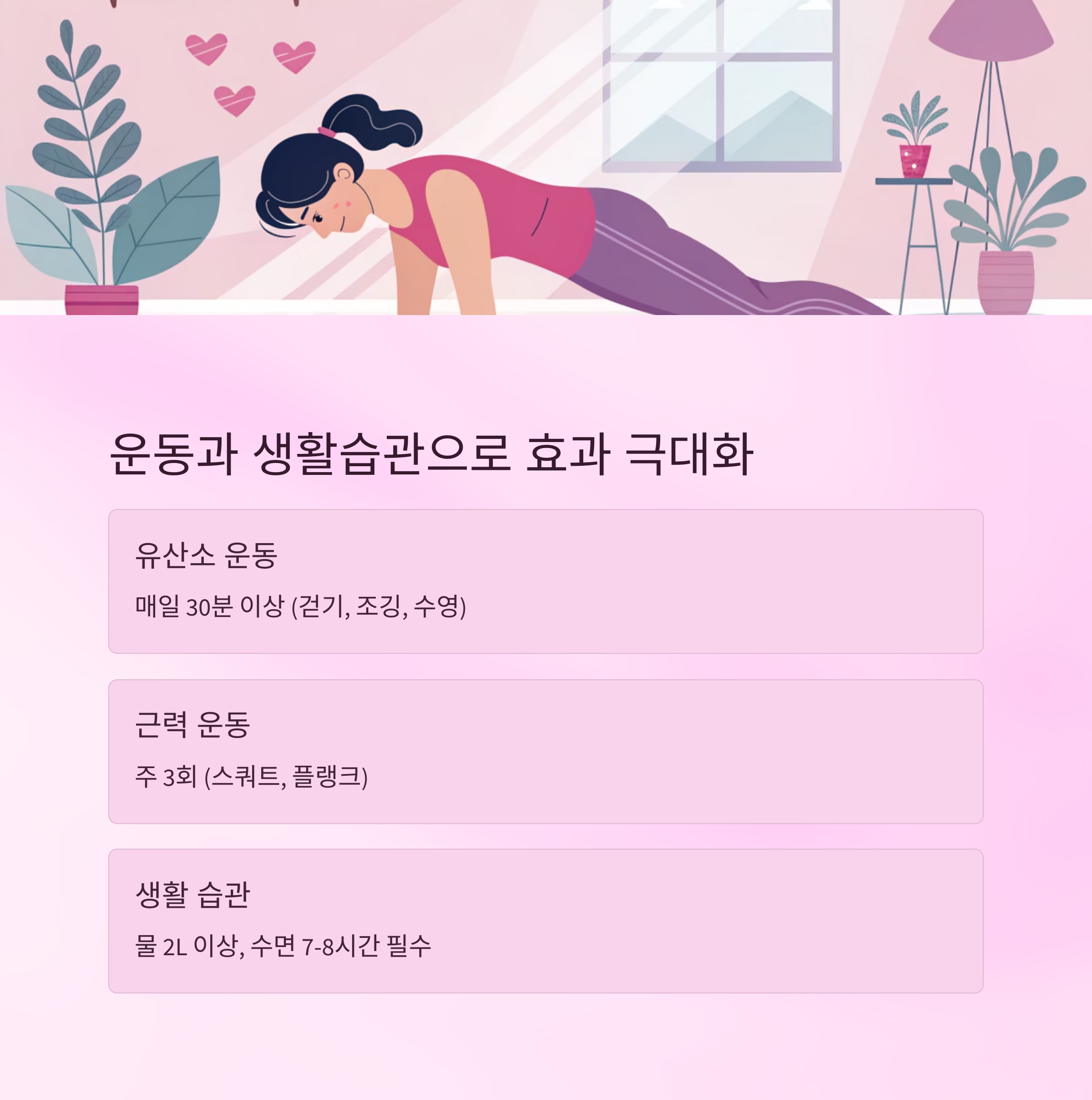 또한 하루 2리터 이상의 물 섭취와 7-8시간의 충분한 수면은 필수입니다.