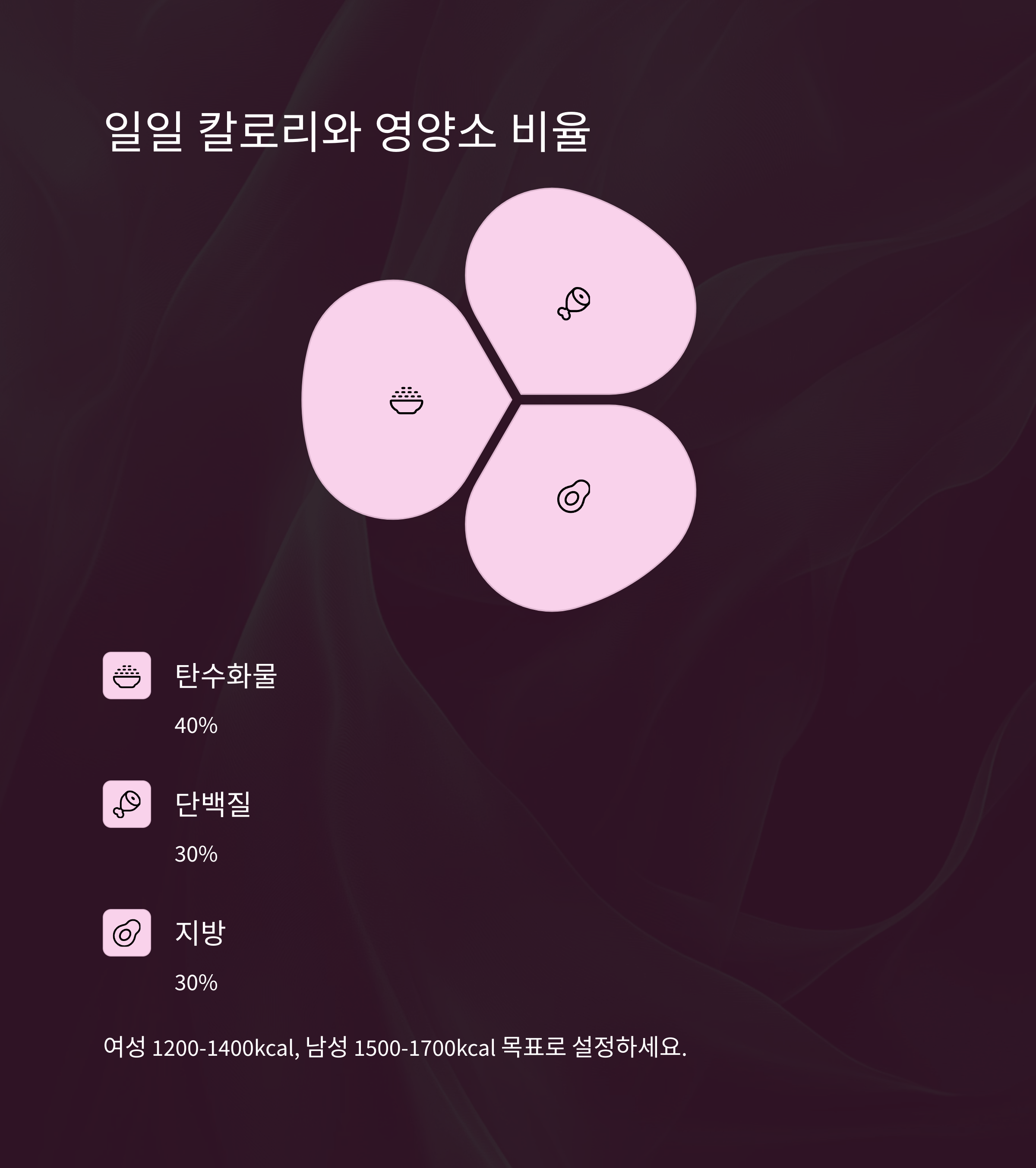 탄수화물 40%, 단백질 30%, 지방 30%의 비율을 유지하는 것이 핵심입니다.
